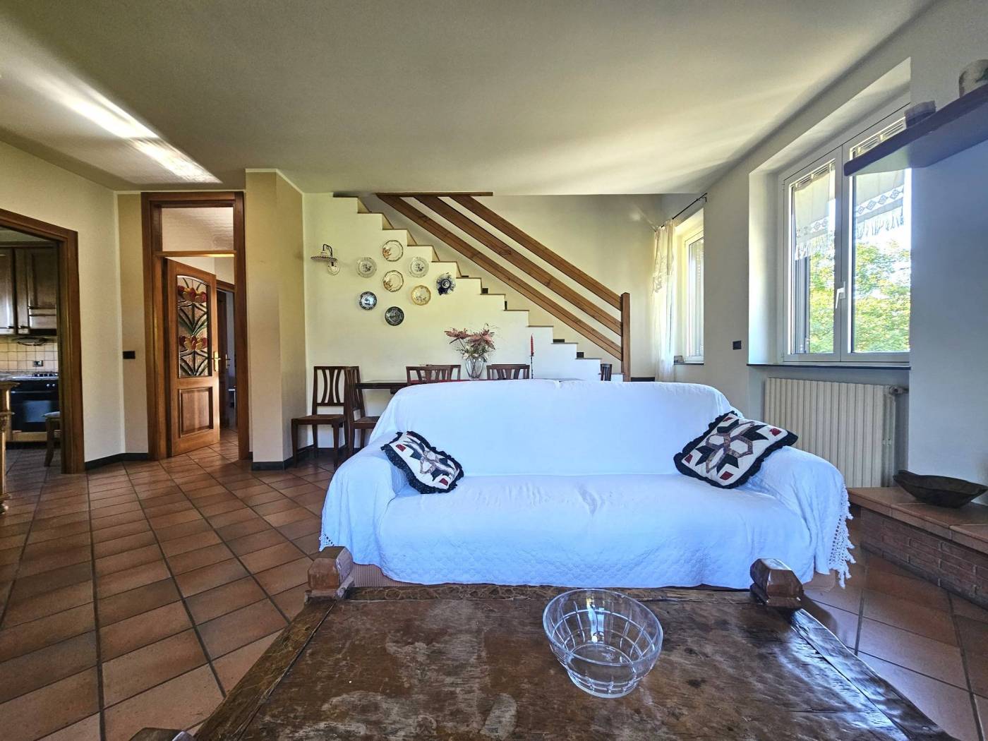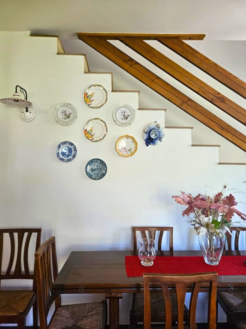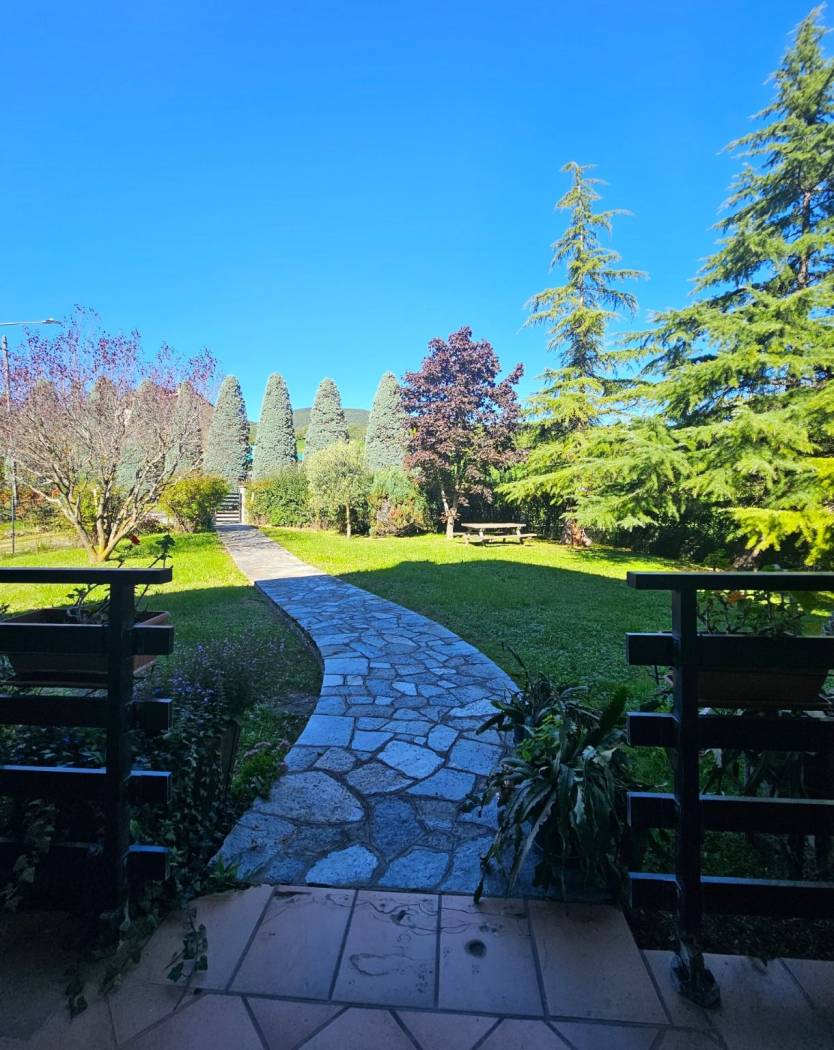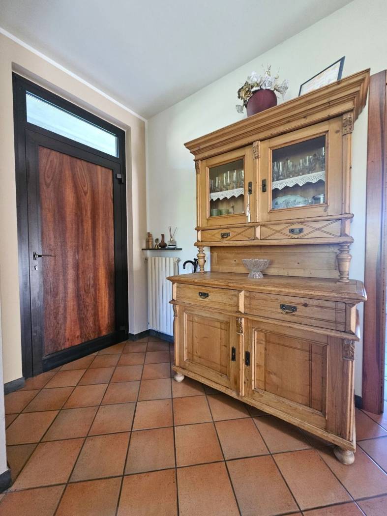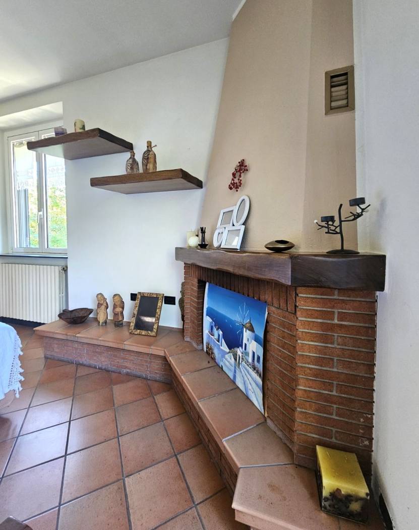 Un vialetto in pietra conduce all'ingresso principale e varcata la soglia si accede a un ampio soggiorno luminoso, caratterizzato da un'atmosfera calda e accogliente grazie al camino e ad una termostufa a pellet. Le portefinestre offrono un dialogo continuo tra interni ed esterni e si affacciano direttamente sul terrazzo vivibile, ideale per pranzi all'aperto e momenti di relax.