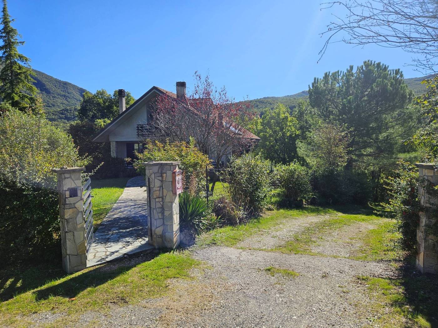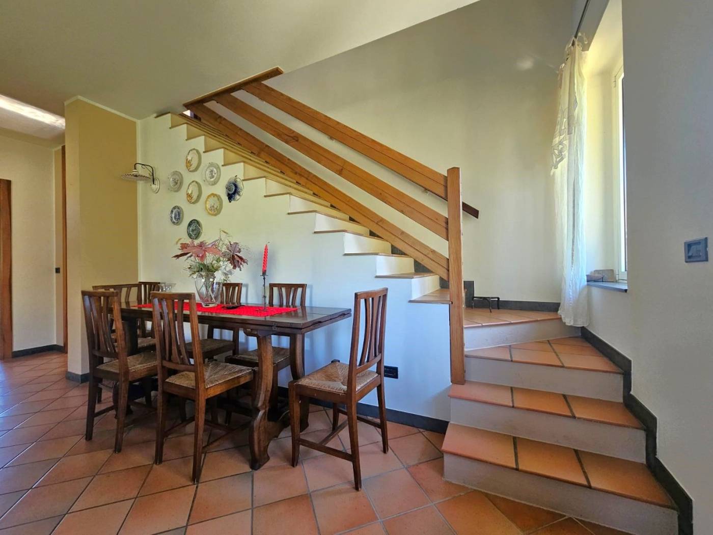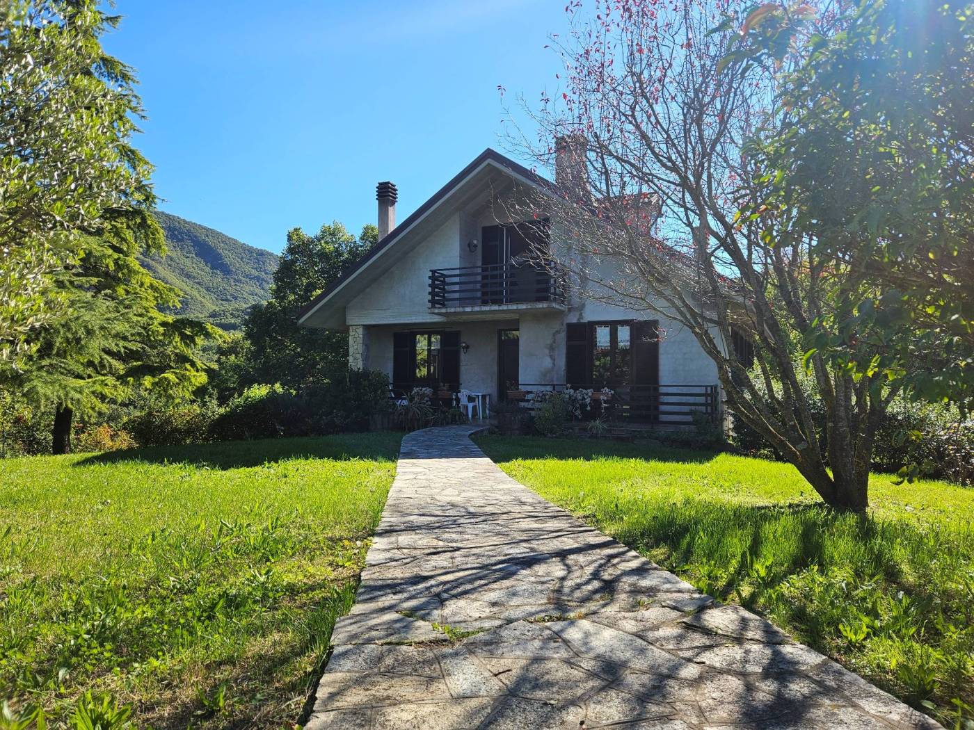 Un vialetto in pietra conduce all'ingresso principale e varcata la soglia si accede a un ampio soggiorno luminoso, caratterizzato da un'atmosfera calda e accogliente grazie al camino e ad una termostufa a pellet. Le portefinestre offrono un dialogo continuo tra interni ed esterni e si affacciano direttamente sul terrazzo vivibile, ideale per pranzi all'aperto e momenti di relax.