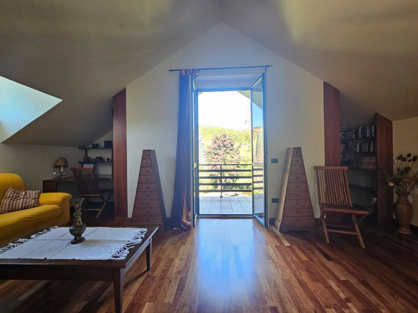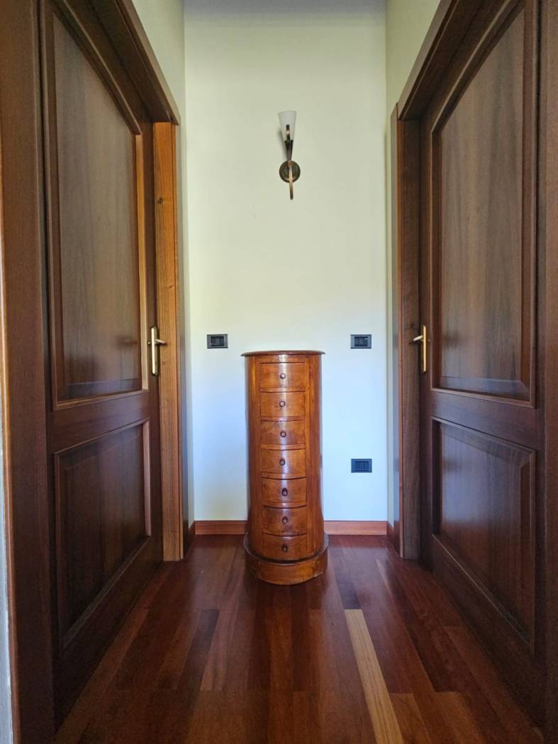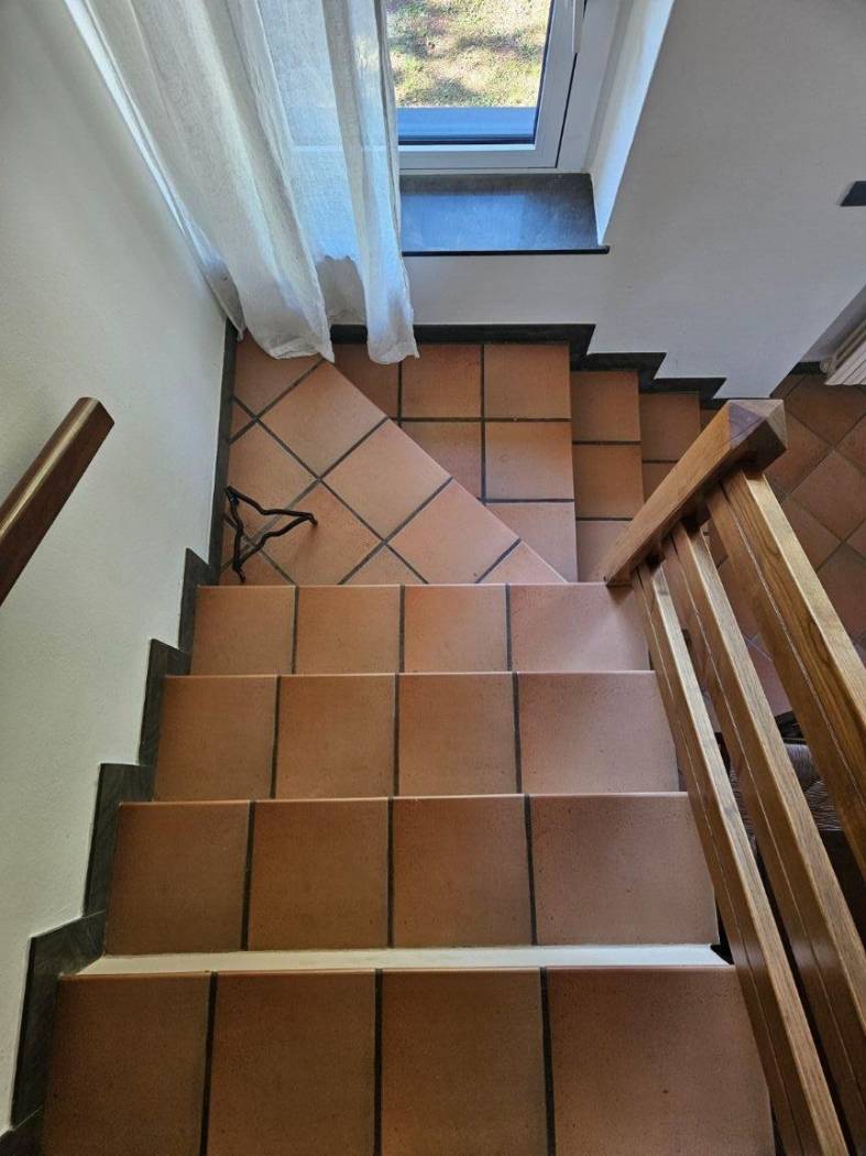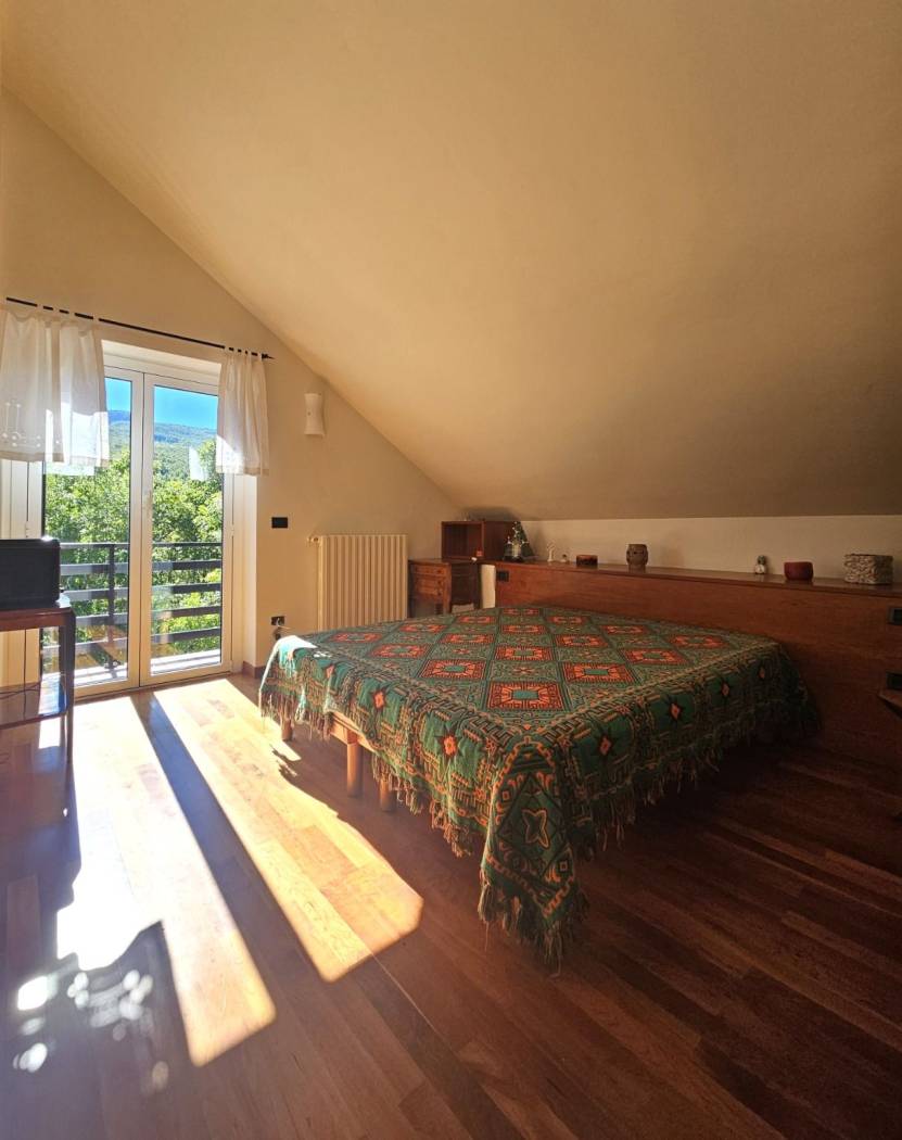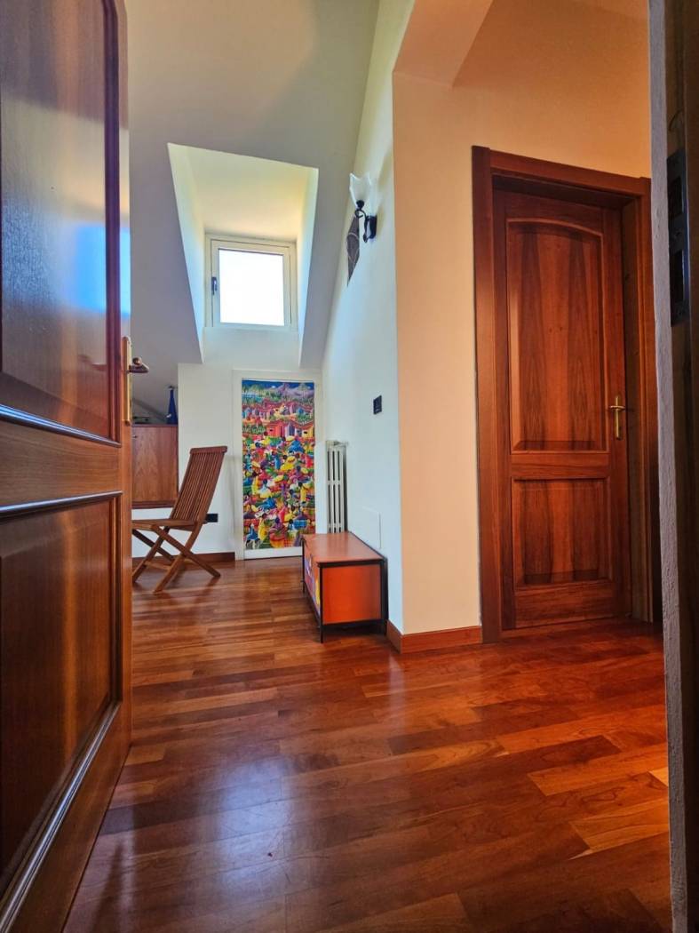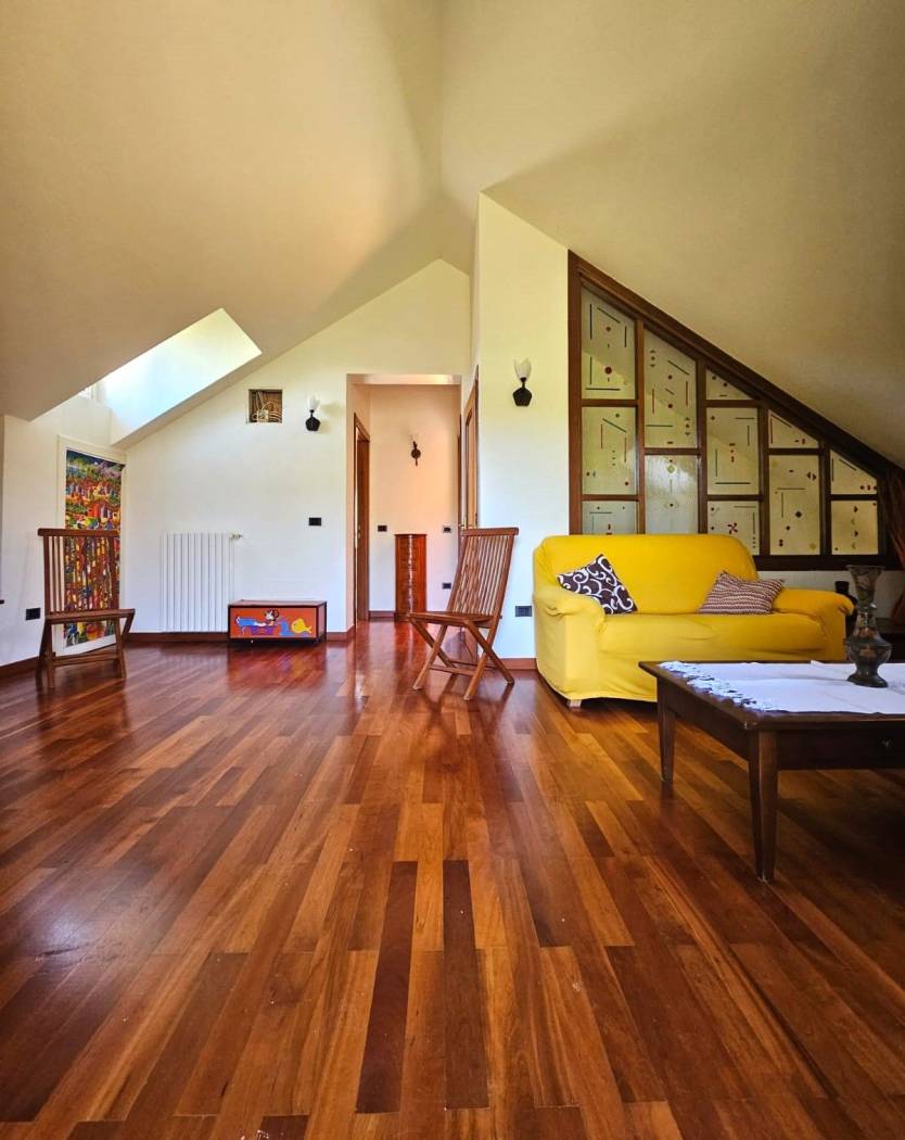 Una scala interna dal soggiorno conduce al primo piano, dove il protagonista è un meraviglioso parquet in perfetto stato. Qui si apre un ambiente dal carattere quasi magico: una grande zona Living con accesso diretto alla terrazza panoramica, da cui godere una vista mozzafiato su tutta la vallata creando un vero punto di forza della Villa. Un ambiente che sembra pensato per chi desidera uno spazio intimo e raffinato.